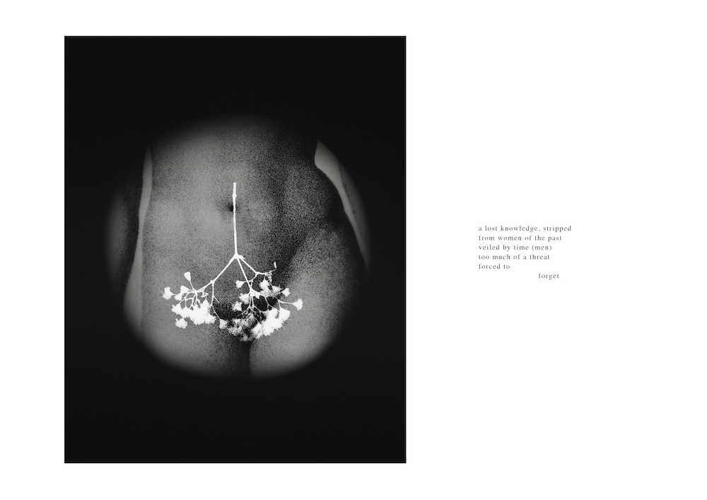 AO: With my work, I found that the context was almost just as important as the images I was making. I wanted to step away from your average project statement plaque on the wall and create something more intimate and part of the work rather than just a description. I thought that poetry would lend itself to the themes in this body of work and the ethereal methods in which the work was made, whilst also allowing me to give the work some context without over-explaining it to the audience. For my most recent exhibition, I chose to print the poem onto a piece of cotton, linking to the cotton these wise women used to make plant-infused suppositories. I hung it on the wall like a towel or bed sheet, meaning the audience had to interact, lift a corner and pull it out in order to read the whole poem. I think this mirrors the secretive ways they would have passed on the information, women to women, about each plant, its dosage and its purpose. By physically revealing the poem, you are also revealing the loss and suppressed knowledge of women. Some art needs no description, what you see speaks for itself, but often art, especially research-based art, needs context and I personally think poetry is a great tool when it comes to contextualising photographic work.